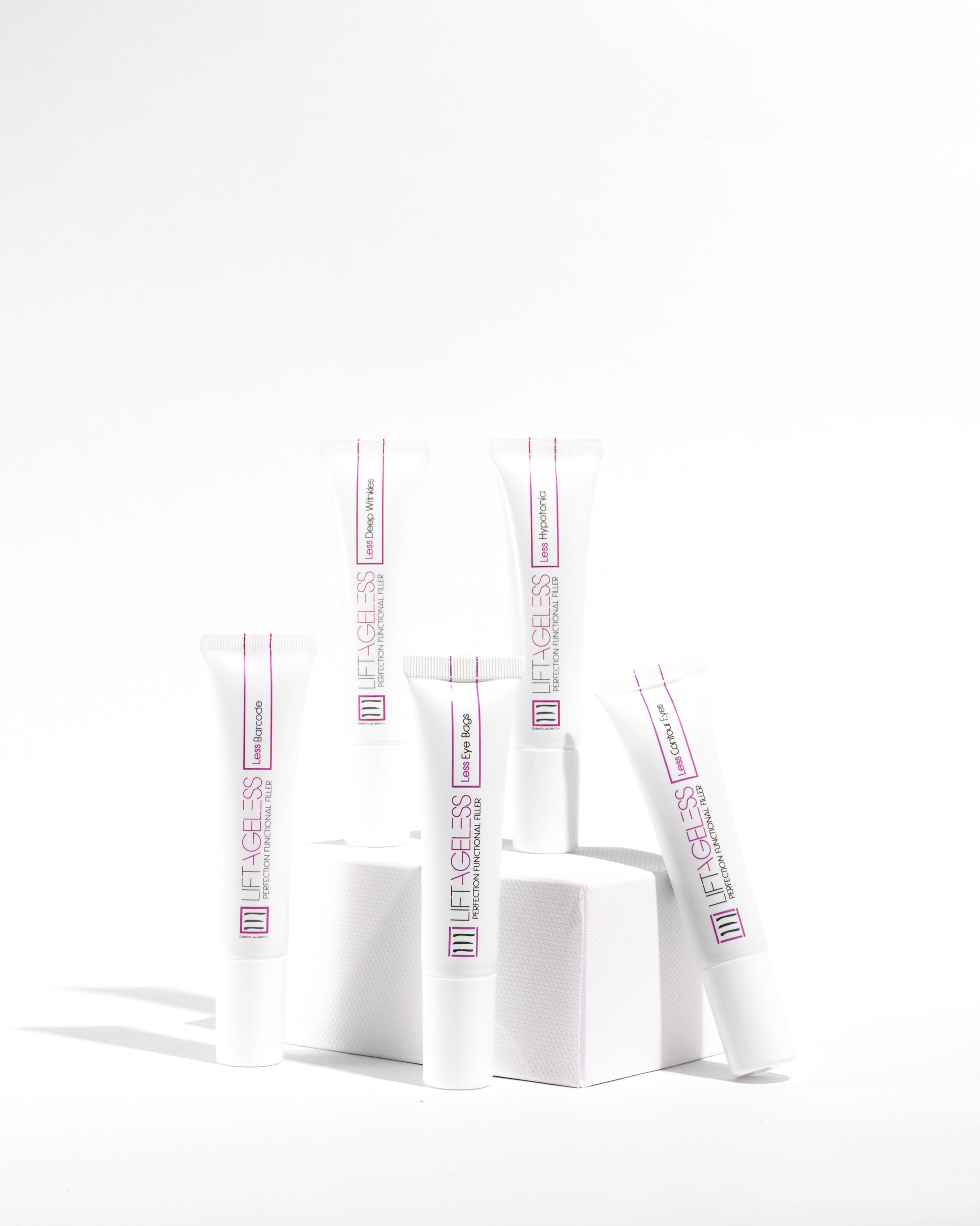 – 1 pz Less Contour Eyes per occhiaie e sguardo stanco. – 1 pz Less Eye Bags per borse e palpebre cadenti. – 1 pz Less Deep Wrinkles per rughe profonde e di espressione. – 1 pz Less Barcode per codice a barre e contorno labbra. – 1 pz Less Hypotonia per perdita di tono e volume.